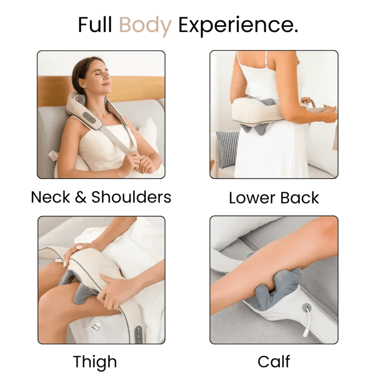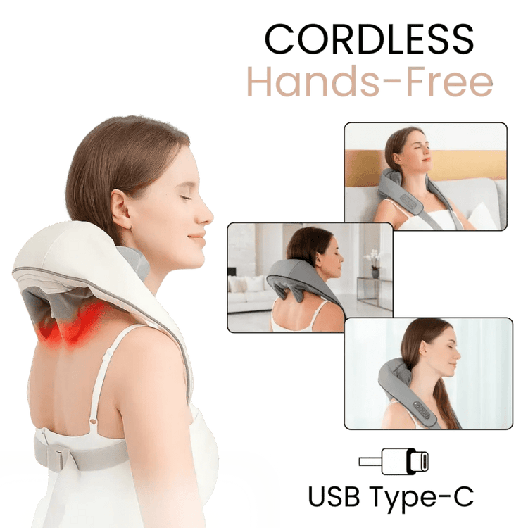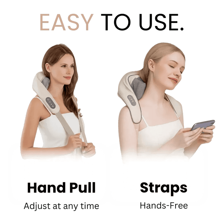 Experience instant relief with deep-tissue kneading and soothing heat, right where you need it. The ergonomic U-shaped design and adjustable straps make unwinding on the go a breeze.